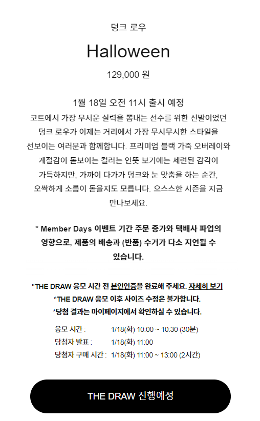 안녕하세요, Prefer입니다:) 지난 드로우는 잘 진행하셨나요, snkrs에 새 드로우가 등록되어 공유드립니다:) 이번 드로우는 덩크 로우 Halloween이네요. 현재 시세는 2배 이상입니다. 한 번 도전해보시는 것도 좋을 것 같습니다.