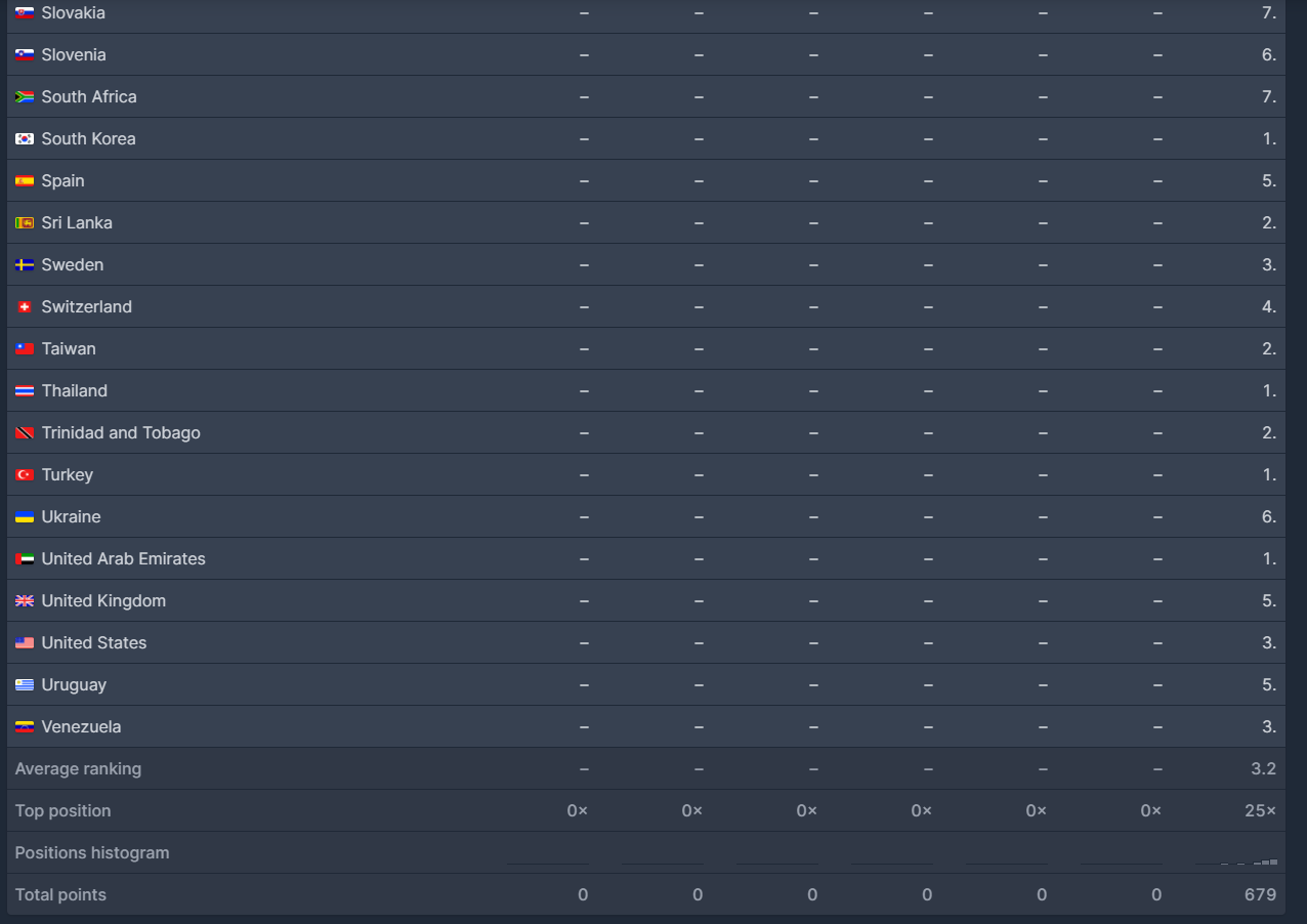 대다수의 나라에서 상위 순위를 기록하고 있으며